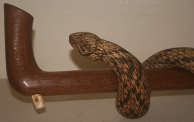 Carl Hicks carved two canes. The first cane was carved from a poison oak vine, Carl stripped off the bark and applied polyurethane before carving. Carl used a straight cane and entwined an intricately carved snake on this base. The second cane was also a poison oak vine and he applied the same procedure as the first. This cane has butterflies on it, he patterned them off of ones which he found in Birds & Bloom magazine . The butterflies were painted with acrylics and finished with clear polyurethane. The wood came from Marshall Field and was a nice wood, but had a pitch that was hard to sand and so he had to smooth it out with a knife.