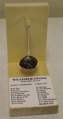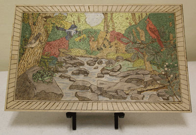 Bernie Budzynski did 2 pencil colored wood burnings, one of a nature scene and one of a pair of woodpeckers in a tree. He also mounted a “Weatherstone” with instructions.