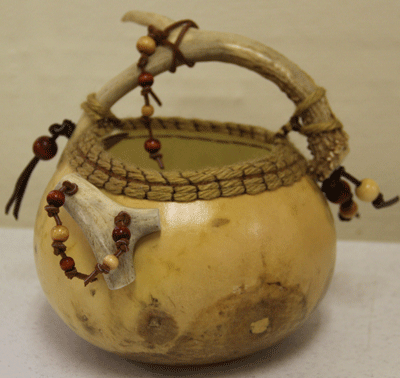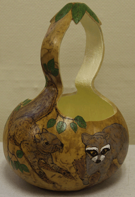 Carrie Lay had 2 nice gourds. One was Woodburned and painted with acrylics. The other decorated with antlers and beads.