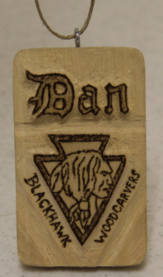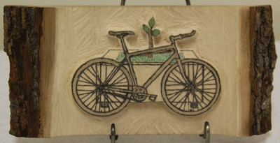 Dan Prutz did a relief carving and painting of a bicycle representing a Chicago Ride called Critical Mass that supports the parks. He also did a Name Tag with Blackhawk Woodcarvers logo and his name.