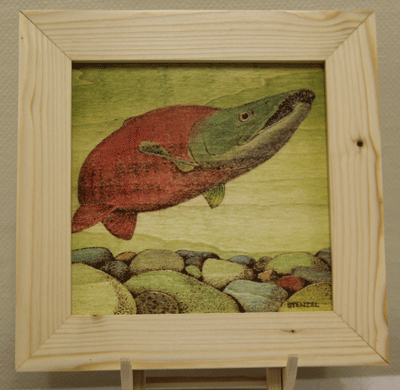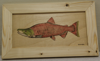 Larry Stenzel presented two nice fish that were woodburned colored and framed.