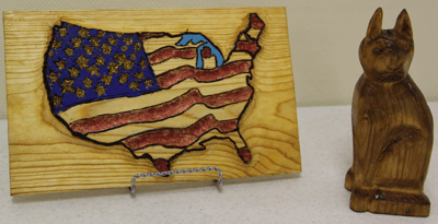 Richard Prutz did an inlay of the U.S.A in pine and painted in color and a cat out of Basswood.