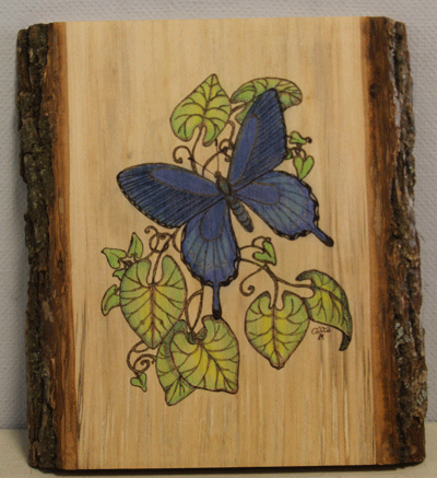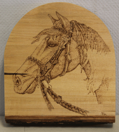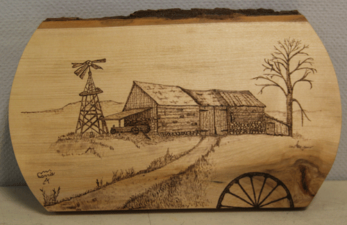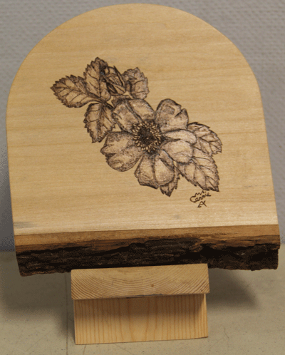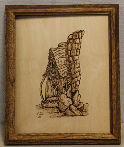 brought in 4 wonderful woodburned plaques of a fantasy house, flower and