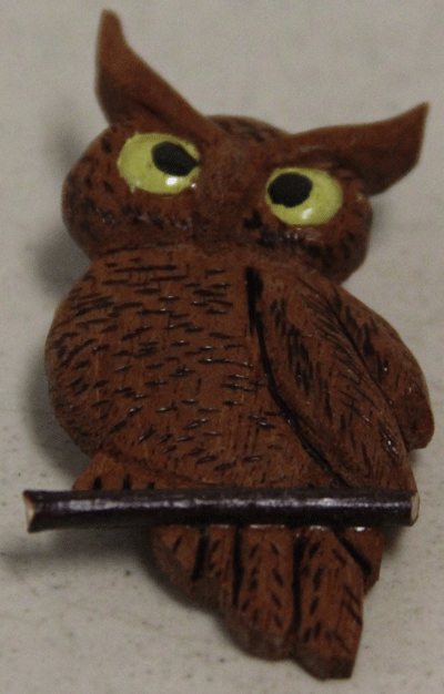 brought in an Owl pin he carved for a friend out of Mahogany.
