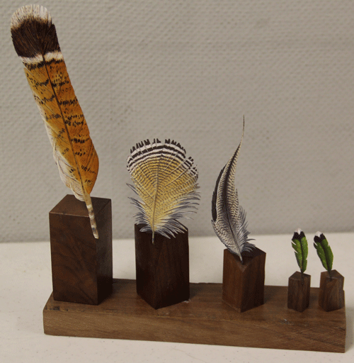 pocket feather; a shoulder feather from a pintail duck; and a tail feather