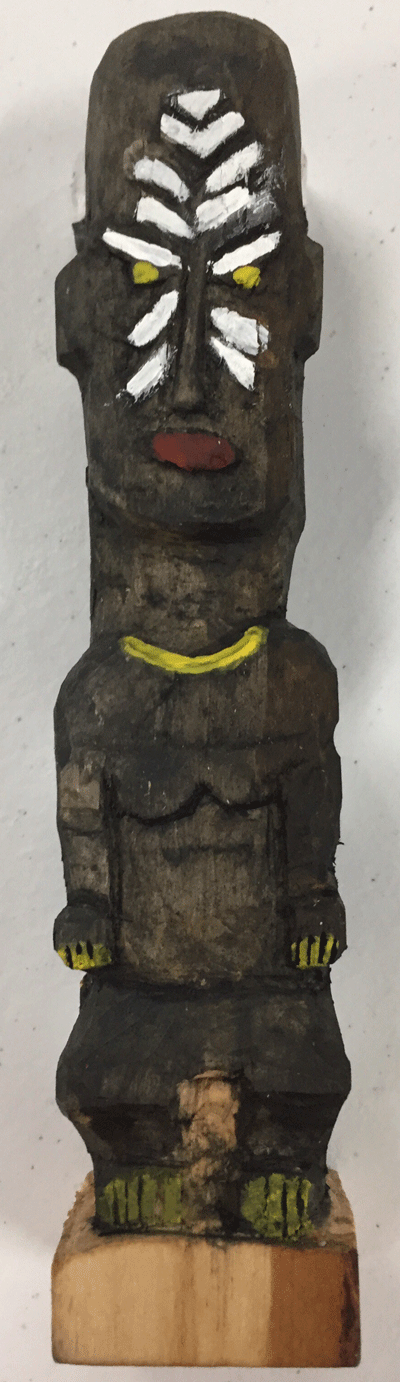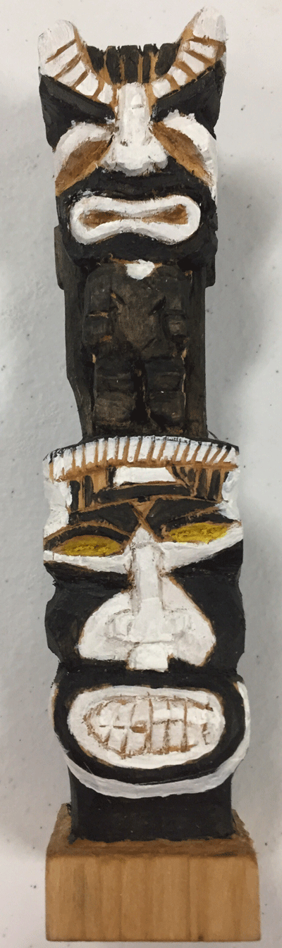 three intricate carvings out of thick Cottonwood Bark that he got from a